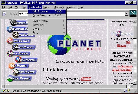 De boekenlegger is nu aangelegd. Wanneer u opnieuw het menu Bookmarks kiest ziet u dat de titel van de pagina met een boekenlegger is opgenomen (in het onderhavige voorbeeld betreft dit 'Welkom bij Planet Internet').