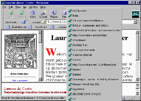 In Netscape 4 is het overigens nog een stuk gemakkelijker geworden om met boekenleggers te werken. Om een boekenlegger voor een pagina te maken, klikt u op het icoontje dat voor het adres staat en sleept het met de muisknop ingedrukt naar het menu Bookmarks. De boekenlegger wordt dan automatisch voor u gecreëerd.