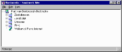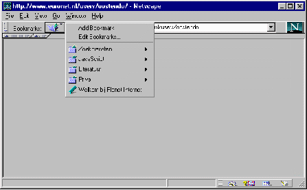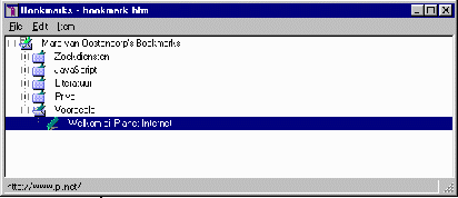 Voor Internet-adressen die u vaak bezoekt kunt u -- zoals u waarschijnlijk weet -- met Netscape Navigator een boekenlegger (bookmark) aanleggen. U doet dit op de volgende manier. Allereerst geeft u Netscape de opdracht de pagina te bezoeken waarvan u een boekenlegger wilt aanleggen. Vervolgens kiest u in het menu Bookmarks de mogelijkheid Add Bookmark. In Netscape 4 vindt u dit menu in de knoppenbalk naast het woord Location of Netsite: