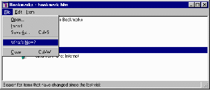 Een interessante extraatje dat dit venster u biedt is de mogelijkheid om te controleren welke boekenleggers er ververst zijn sinds de laatste keer dat u ze bezocht. Door deze mogelijkheid van tijd tot tijd te gebruiken kunt u zich veel tijd besparen. U hoeft dan namelijk alleen die pagina's te bekijken die echt nieuwe informatie bevatten, en geen tijd te verspillen aan oud nieuws. U kiest hiervoor de mogelijkheid What's New? in het menu File: