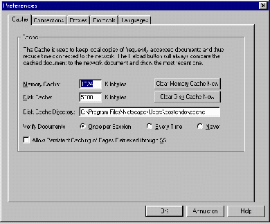Er zijn nog andere mogelijkheden om de snelheid van het programma te vergroten. Eén ervan is de uitbreiding van het zogenaamde cache-geheugen. Dit is het gedeelte van uw harde schijf dat gebruikt wordt om reeds opgevraagde informatie op te slaan. Wanneer u deze informatie opnieuw opvraagt -- bijvoorbeeld omdat het een logo betreft dat op meerdere pagina's binnen een site terugkomt, of omdat het een pagina is die u geregeld bezoekt -- wordt deze niet helemaal van het Internet gehaald, maar van uw eigen harde schijf. Die laatste is natuurlijk wat dichterbij. Dat komt de snelheid ten goede.