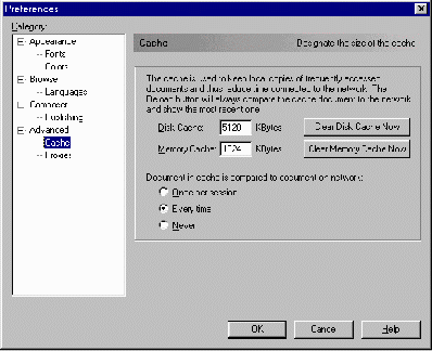 Hoe groter nu uw cache-geheugen is, des te meer informatie er kan worden opgeslagen. Dat komt de snelheid uiteraard ten goede. De mogelijkheden om het cache-geheugen te vergroten vindt u in het tabblad Cache van het venster Network Preferences. U vindt dit onder Advanced bij Preferences onder het menu Edit in Netscape Navigator versie 4: