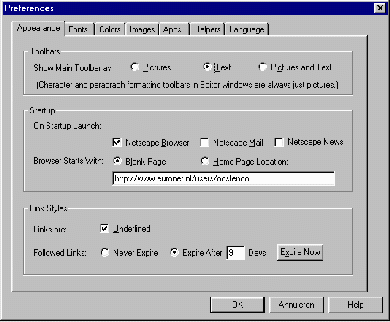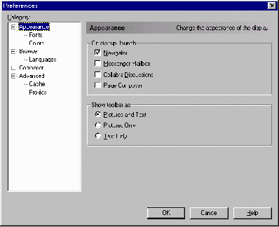 De meeste mogelijkheden tot aanpassing vindt u in Netscape 4 in de afdeling Preferences, een onderdeel van het menu Edit. In eerdere versies vindt u in de afdeling General Preferences van het menu Preferences.U vindt het onder de naam Options op de menubalk. In beide gevallen krijgt u het venster Preferences te zien: