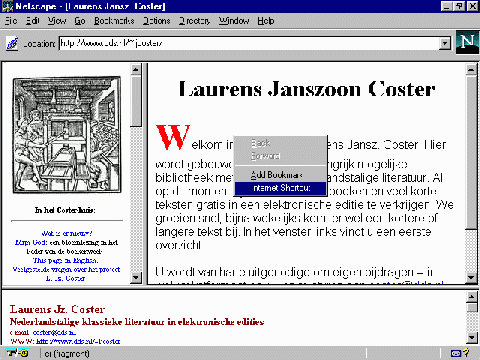 Om een Internet Shortcut te maken, gaat u weer naar de pagina van uw voorkeur. U klikt vervolgens boven een willekeurige plaats op die pagina met de rechterknop van uw muis. Er verschijnt dan een klein menu. Hierin kiest u de mogelijkheid Internet Shortcut: