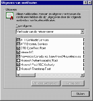 Jawel, zult u zeggen, maar hoe weten we nu zeker dat deze zelfbenoemde notarissen op Internet te vertrouwen zijn? Het antwoord is dat ook CA's zelf weer certificaten kunnen krijgen van autoriteiten van een nog hogere orde. Het idee is dan dat we op zijn minst deze hogere autoriteiten kunnen vertrouwen. Het is zoiets als met beroepsverenigingen: misschien weet u niet of u een makelaar op zijn woord moet geloven als hij u een huis aanbeveelt; maar dat verandert dan wellicht als blijkt dat deze makelaar lid is van de NVM. Een andere manier waarop een CA ons vertrouwen kan winnen is door een aanbeveling van instanties of mensen die we om andere redenen kennelijk toch al wel vertrouwen: de makers van Internet-browsers bijvoorbeeld; als u de firma's Netscape en/of Microsoft niet vertrouwd is het in ieder geval sowieso onverstandig om van deze firma's de geleverde waren te betrekken.