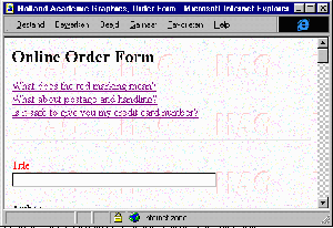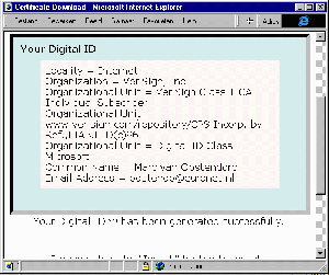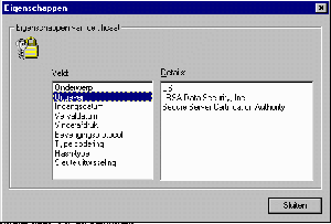 In dit geval is het bedrijf dat het certificaat verstrekt heeft RSA Data Security. Dat de pagina beveiligd is, betekent dat hij versleuteld naar u is opgestuurd, en vooral dat hij versleuteld wordt teruggestuurd naar de informatieaanbieder. Voor die versleuteling wordt de publieke sleutel van de informatieaanbieder gebruikt; niemand kan daarom aan het door u in dit formulier opgegeven creditcardnummer komen, behalve degene die de geheime sleutel kent. Zo heeft u een redelijke zekerheid dat er niets met dit vertrouwelijke gegeven kan gebeuren.