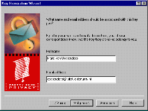 Het programma vraagt u om uw naam en uw e-mailadres. Uw publieke en private sleutels zullen aan deze naam gekoppeld worden. Als u wilt kunt u uw naam en adres samen met de zodadelijk voor u gecreëerde publieke sleutel in een openbaar archief plaatsen -- het programma helpt u daar ook bij.