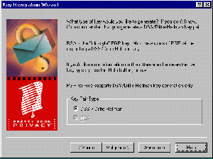 Het programma stelt u vervolgens nog enkele vragen, zoals naar het te gebruiken algoritme (in de eerste versies was dit de zogenaamde RSA-techniek van de wiskundigen Rivest, Shamir en Adleman; tegenwoordig is dit om technische en vooral juridische redenen het zogenaamde DSS-protocol).
