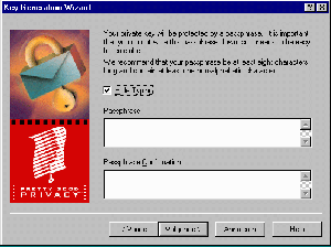 Tenslotte kunt u -- opvallend genoeg -- een wachtwoord opgeven. Het programma PGP kunt u voortaan gebruiken om uw persoonlijke berichten te versleutelen en te ontsleutelen zonder dat u hoeft te begrijpen wat de algoritmes zijn of wat u geheime of publieke codes zijn. Dit alles verzorgt het programma voor u. Dat betekent dat degene die uw computer aan kan zetten en het programma PGP kan starten ook in een handomdraai uw codes kan breken. Dit wachtwoord werpt in ieder geval weer een kleine blokkade op.