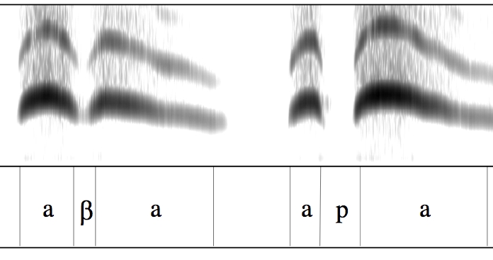 Verder zien we ook een verschil tussen v en p. In het eerste geval loopt het spectogram bijna vloeiend door tussen de twee klinkers: de onderbreking is minimaal. De p veroorzaakt aan de andere kant echt een gat tussen de eerste a en de tweede. Dit verschil weerspiegelt het feit dat in gesproken taal de stembanden blijven trillen bij een v terwijl ze even niet meer trillen bij de p (dat kun je makkelijk nagaan door zelf p-p-p en v-v-v te zeggen terwijl je je vingers tegen je strottenhoofd legt: in het eerste geval voel je niets, terwijl je in het tweede geval trilling voelt. Als er geen stembandtrilling is, is er geen toon, en kunnen er dus ook geen boventonen zijn; alleen bij een klank als een v kan een spectogram doorlopen.