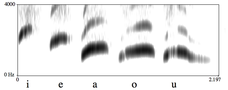 Voor een taal als het Spaans heb je doorgaans aan F2 genoeg om klinkers te onderscheiden: wie goed kijkt ziet dat deze bundel van links naar rechts steeds iets lager komt te liggen. Dit komt doordat de klinkers i, e, a, o, u in deze volgorde steeds iets verder achterin de mond worden gearticuleerd: hoe verder achterin de mond, des te lager wordt de F2.
